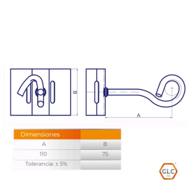 Ménsula con ojal abierto fabricada en acero F-24, ideal para suspender o retener cables de fibra óptica. Recubrimiento galvanizado por inmersión en caliente y una capacidad máxima de retención de 500 kgf. Compatible con abrazaderas BAP o flejes de acero inoxidable.